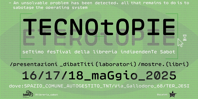Leggi tuttoA Jesi dal 16 al 17 maggio, ‘Eterotopie’ quest’anno cambia nome TECNOTOPIE Settimo festival della libreria indipendente Sabot 16/17/18 Maggio